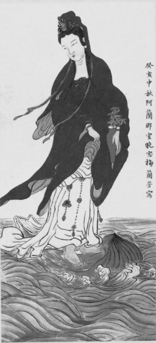 泰州市梅兰芳纪念馆藏有梅兰芳1923年中秋作的一幅《观音像轴》。画面中观音菩萨足踏莲花、手持净瓶。微微颔首,双目凝视下方大千世界,似正欲作普度众生之巡航。观音像面部刻画细腻,表情平静凝重,颇有高古之风,与情境十分吻合。线条虚实处理极为见工,圆转、刚劲兼而有之。人物刻画的功力十分深厚。