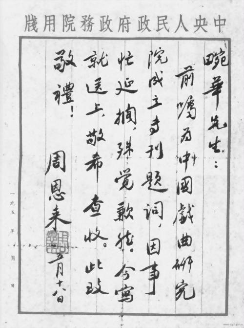 1949年9月下旬,梅兰芳应邀出席第一届中国人民政治协商会议。会议期间,周恩来告知梅兰芳,希望他能担任即将成立的中国戏曲研究院、中国京剧院院长。1951年3月,梅兰芳奉命到北京筹建中国戏曲研究院。1951年4月3日,中国戏曲研究院成立,梅兰芳被任命为院长。在此期间,梅兰芳曾请毛泽东、周恩来为研究院成立专刊题词,而周总理因公务繁忙,未能及时履约,后在当年5月18日题词:“重视与改进,团结与教育,二者不可缺一。”同时手书一札,一并寄给梅兰芳先生。