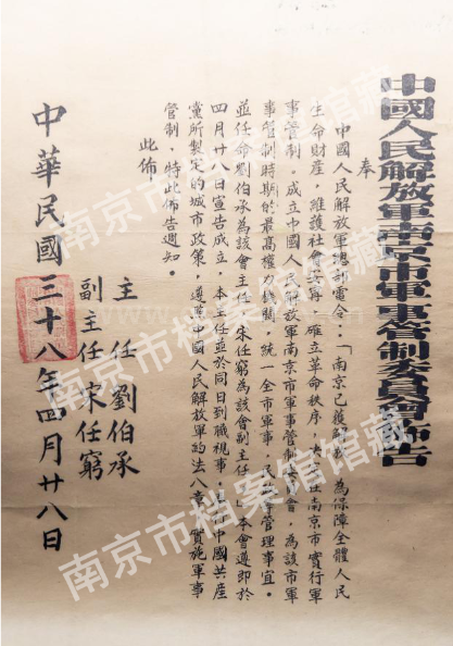 如今,这张“军管字第一号公告”珍藏于南京市档案馆,成为南京新生的见证。
