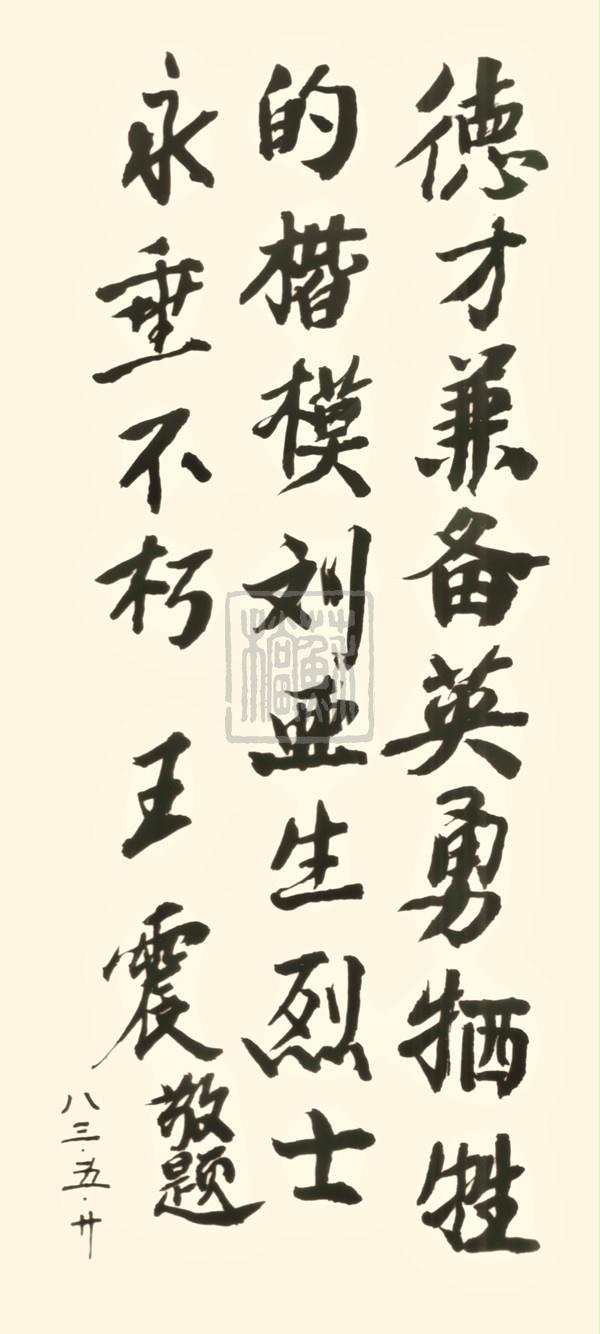 内容及评介:刘亚生,1932年考入北京大学,1937年投笔从戎,在八路军三五九旅任旅部秘书、旅政治部主任,1946年在向延安转移途中被俘,1948年10月被杀害于南京。1983年是刘亚生就义35周年,原八路军三五九旅旅长兼政委王震题词:“德才兼备,英勇牺牲的楷模——刘亚生烈士永垂不朽“。该题词体现王震对刘亚生烈士的高度评价和深情缅怀。