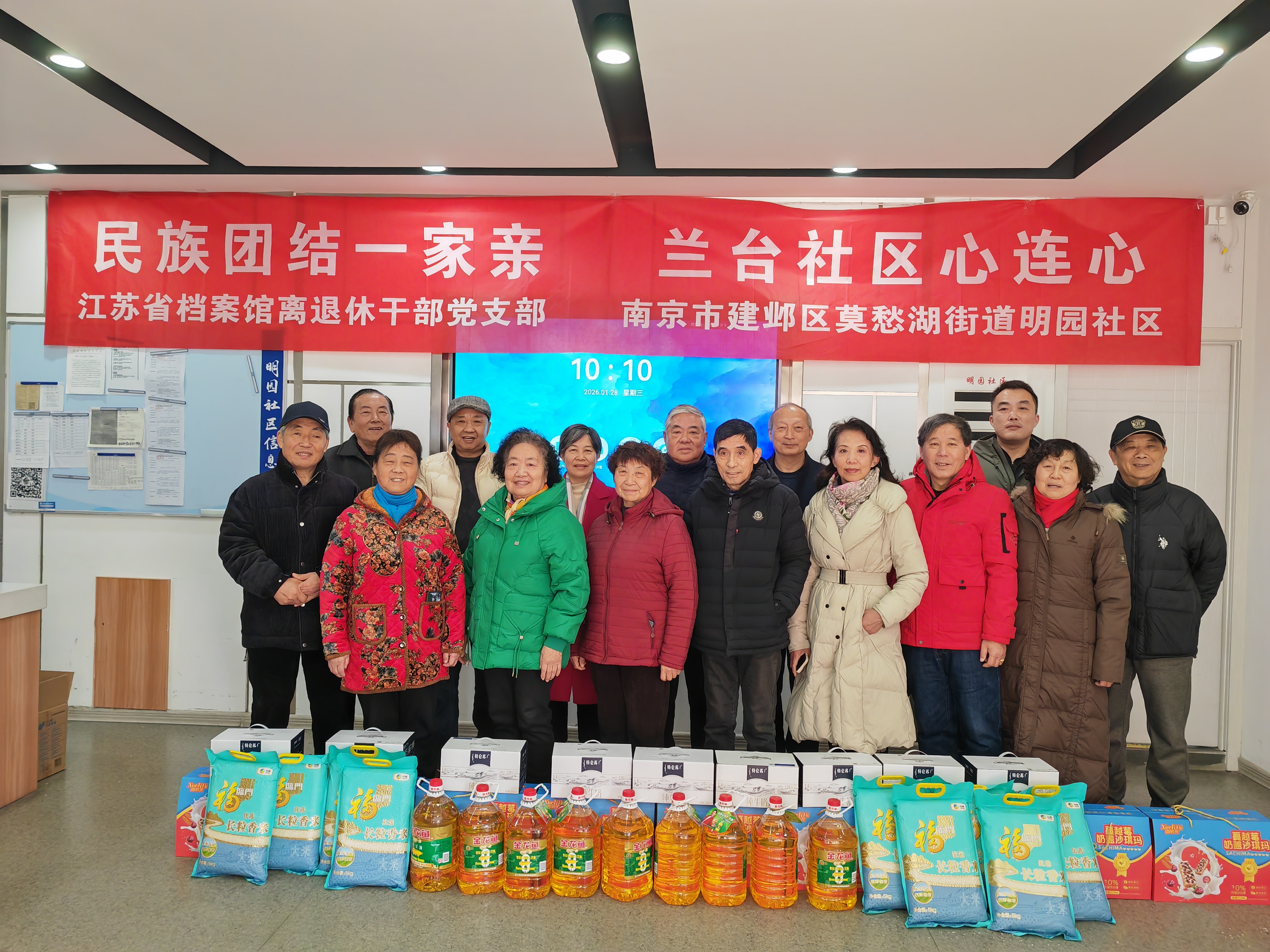 离退休干部第二党支部党员来到国家民族事务委员会命名的第十二批全国民族团结进步示范区示范单位——南京市建邺区莫愁湖街道明园社区,与深耕社区治理服务一线的党员和群众志愿者开展座谈交流,并向社区志愿者和困难群众赠送了一批节日慰问品。社区志愿者分享了扎根基层、默默奉献,以点滴服务践行初心使命,将“志愿微光”汇聚成基层治理温暖星河的故事。支部党员还与社区志愿者交流以党建引领银龄力量、开展志愿服务、助力基层治理提质增效的心得体会。