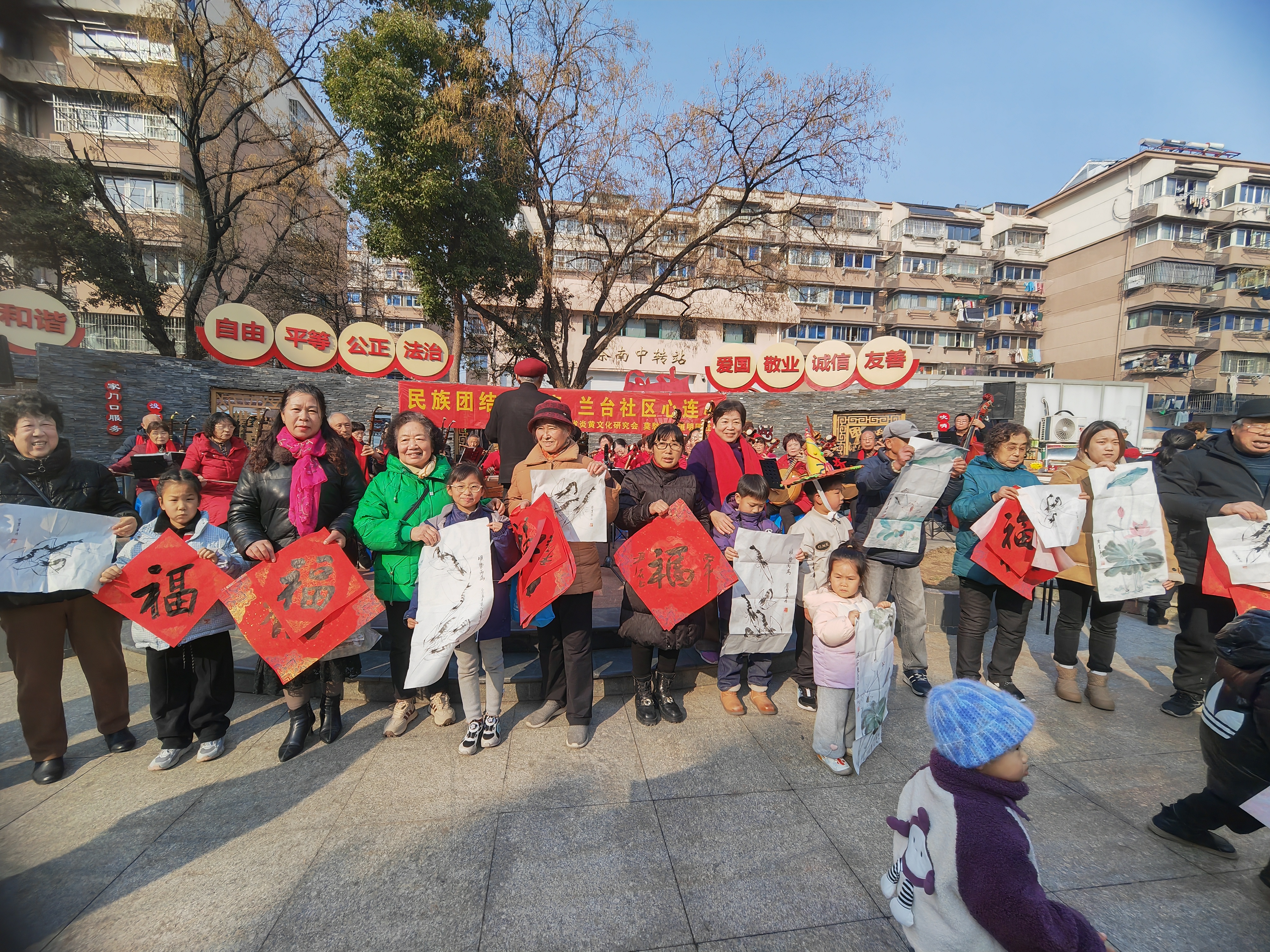 老同志们与特邀书法家尹石、刘洪友、陈新民以及明园民乐团一起,齐聚明园社区红石榴广场,为居民书写象征吉祥如意的“福”字,赠送寓意和和美美的画作,演奏欢快轻松浪漫的乐曲,并向社区赠送一幅“爱民”书法作品,共同举办了一场别开生面的“民族团结一家亲 兰台社区心连心”联欢活动。